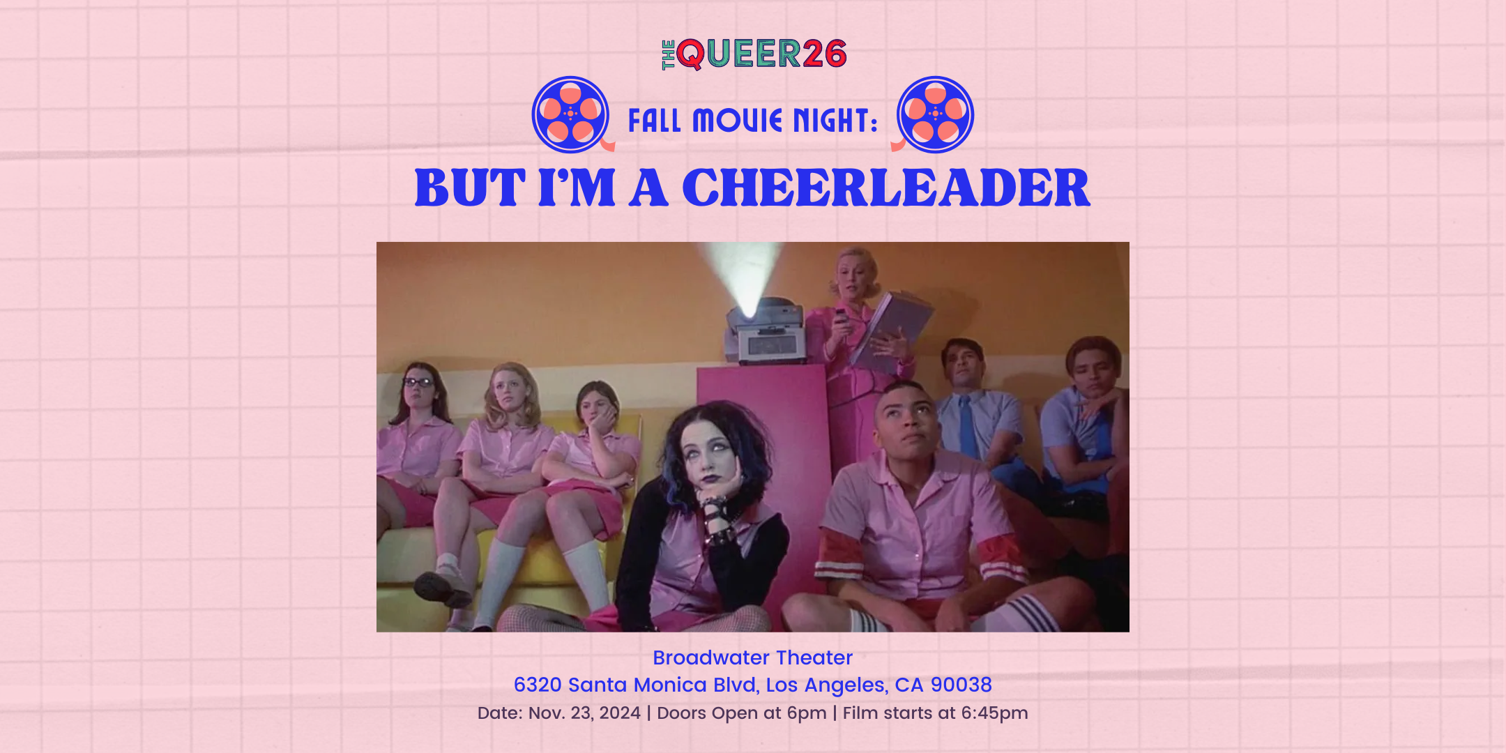 Come join us at Broadwater Theater for a movie night with The Queer 26! We're watching BUT I'M A CHEERLEADER, dir. by Jamie Babbitt and featuring Natasha Lyonne, Clea Duvall, and RuPaul. The film will be followed by a short group discussion in a safe, queer environment.